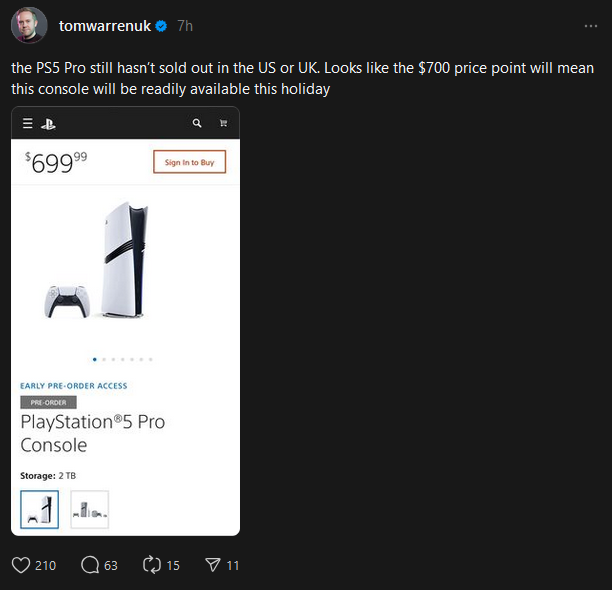 arrow-up1416arrow-down1image[Tom Warren] The PS5 Pro still hasn’t sold out in the US or UK. Looks like the $700 price point will mean this console will be readily available this holidaylemmy.world2pt_perversion@lemmy.world to Games@lemmy.worldEnglish · 1 day agomessage-square187fedilink