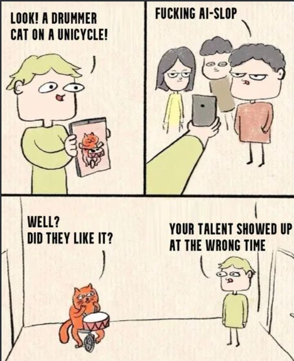 arrow-up199arrow-down1imageAI sloplemmy.mlZerush@lemmy.ml to Memes@lemmy.ml · 2 hours agomessage-square1fedilinkcross-posted to: memes@sopuli.xyz
