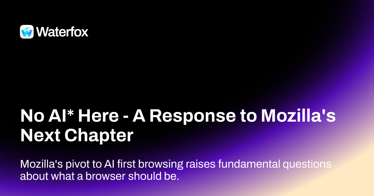 arrow-up190arrow-down1external-linkNo AI* Here - A Response to Mozilla's Next Chapter - Waterfox Blogplus-squarewww.waterfox.combrianpeiris@lemmy.caEnglish · 27 days agomessage-square12fedilink