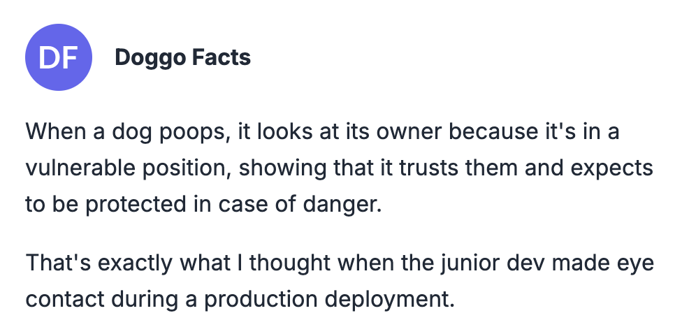 “You remind me of Buddy. He gets that same look in his eye, right when he finds the right spot to take a dump. You’re gonna go far, kid, we’re taking you to the park after this!”
