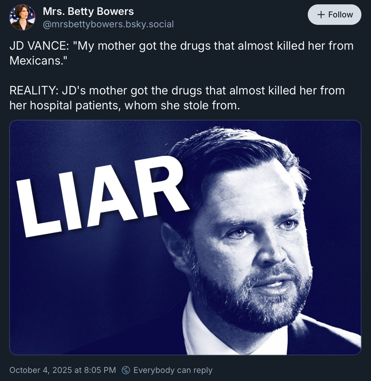 James Donald Bowman is a sad excuse for a human being. I will always remind people of his real name he got from his deadbeat father and the mother he’s slandering here. Just to cuck for another asshole named Donald.