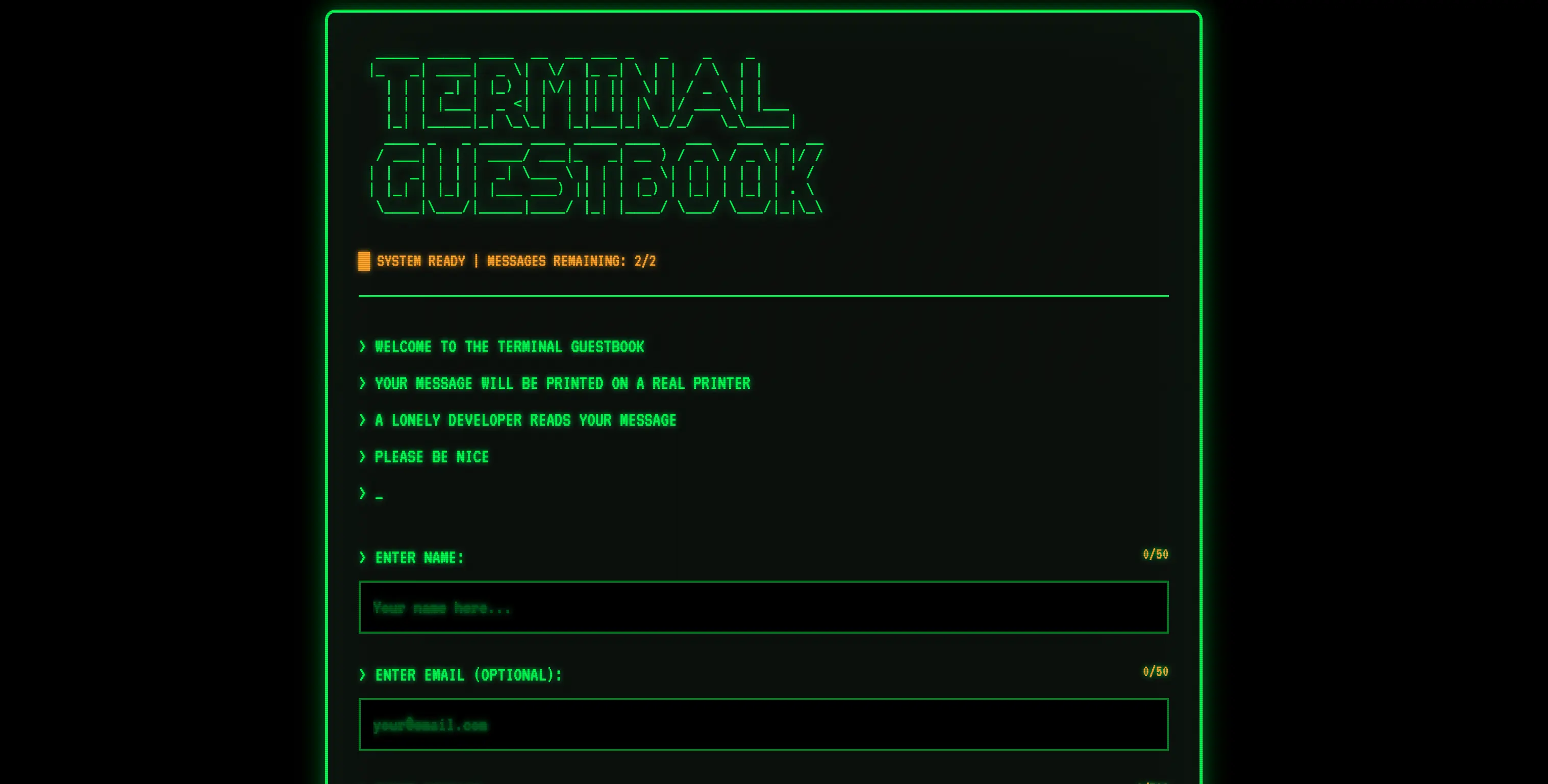 I saw this idea somewhere else and I wanted to build it for myself because I was fascinated by it. So I did. You can enter your nick name, a message (optional email address and image) and send it to me. It will print immediately and I will see your message. There’s also an easter egg that you can discover. :)
