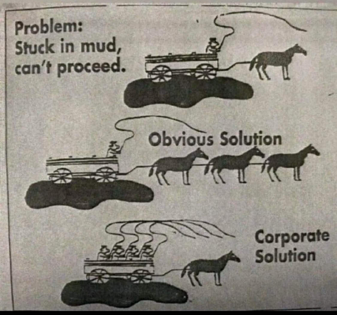 Almost. The corporate solution nowadays is for the guy who owns all of the carts to replace the horses with AI, fire half of the drivers, then demand the remaining drivers take two carts every trip.