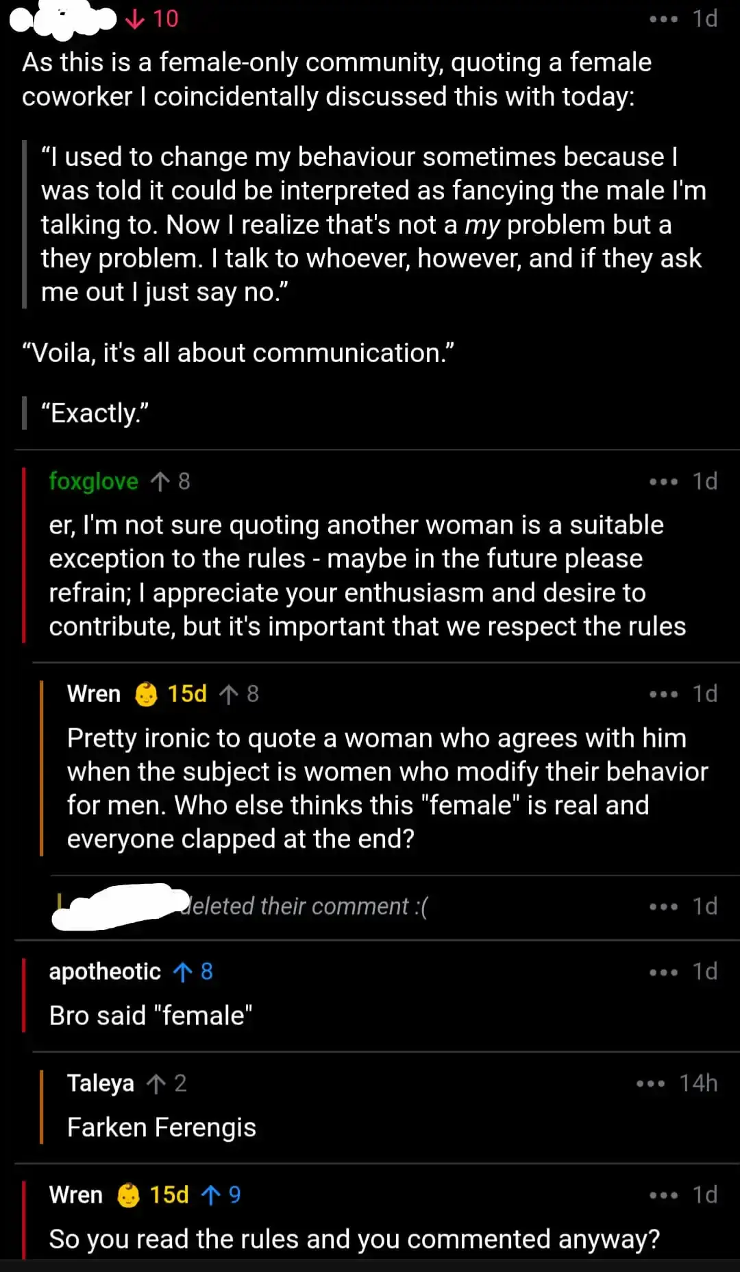 I am in full support of the community rules but that’s an interesting claim when like 1/3 of the posts are about men lol