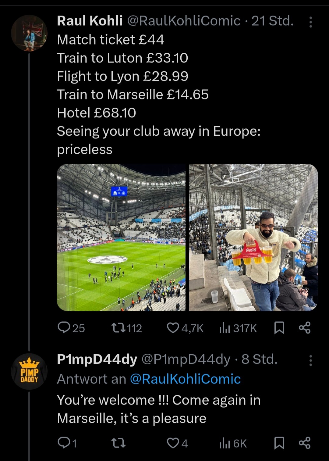 The post is missing the included trip to the hospital after they throw coins with glued on razor blades and shoot firework rockets at you. Never heard of more aggressive “fans”. Marseille as a foreign fan, not even once (it may be once only anyway).