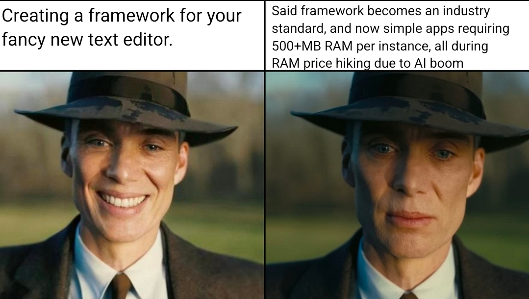 It’s kind of an abomination when VsCode, supposed to be a lighter IDE, runs like dogshit compared to JetBrains, a fuckin’ Java based IDE. Since when was Java light on RAM?