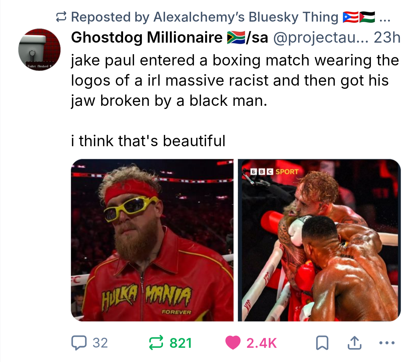 One racist fake fighter wears the costume of another racist fake fighter thinking he’s a champion and promptly gets taught that exhibition matches aren’t shit, and that your opponent hits a lot harder when they train and fight to win, rather than for sponsorships and youtube clout.