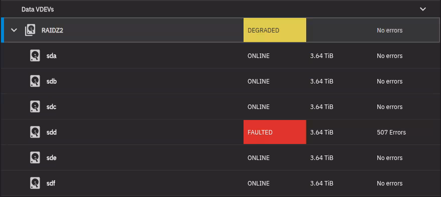 Now after filling the 15 TB of RAIDZ2 with around 100gb of data. One of the drives started waiving its white flag and wants to die on me.