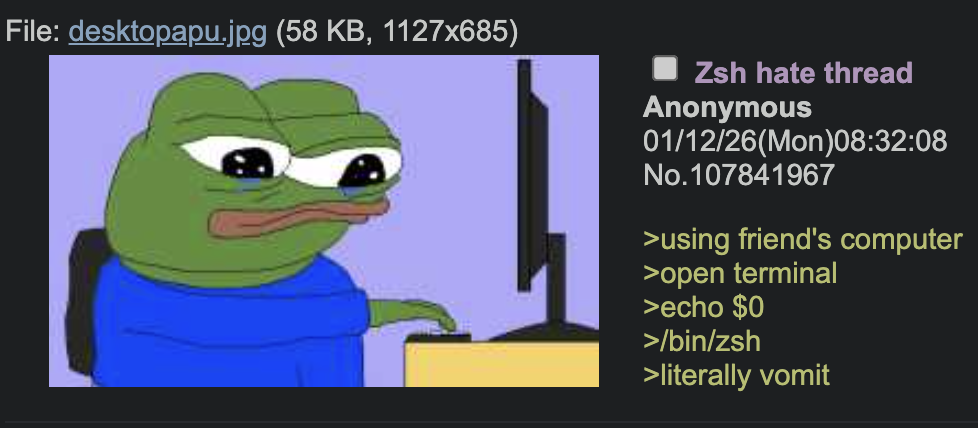 I switched from bash to zsh a while ago, mostly just for shits and giggles. I really can’t see any reason to form a strong opinion on it one way or the other.