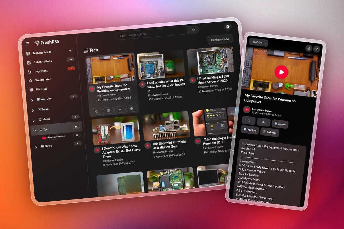 Youlag is a FreshRSS extension that allows you to browse your YouTube and article feeds through a modernized design that incorporates quality-of-life features.
