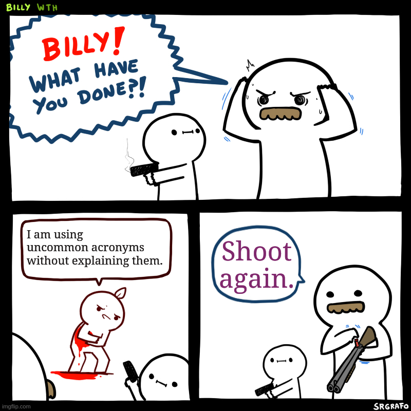It’s a defence mechanism. I want to scare people away from trying to participate in a topic they know nothing about but feel like an expert in. Those that do know about the acronyms are worth the while.