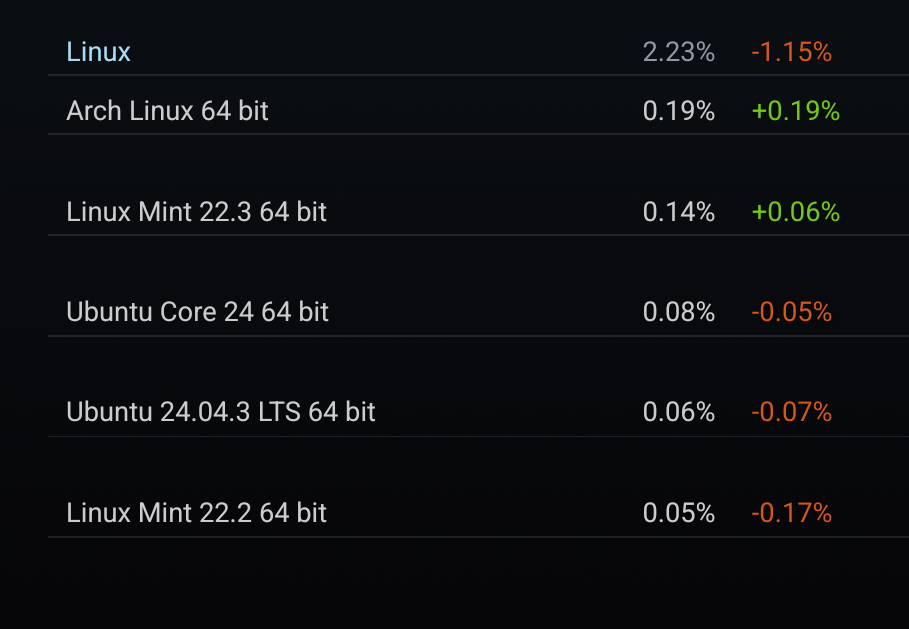 cm0002@lemmings.world to Linux@programming.dev · 9 days agoSteam hardware survey for February 2026. What happened? Why did it lose such a big percentage?lemmy.worldimagemessage-square9fedilinkarrow-up156arrow-down13