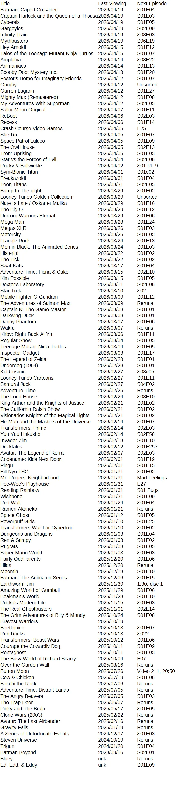 Plaintext: Title Batman: Caped Crusader Captain Harlock and the Queen of a Thousand Years Cybersix Gargoyles Infinity Train Mythbusters Hey Arnold! Tales of the Teenage Mutant Ninja Turtles Amphibia Animaniacs Scooby Doo; Mystery Inc. Foster’s Home for Imaginary Friends Gumby Gurren Lagann Mighty Max (Remastered) My Adventures With Superman Sailor Moon Original ReBoot Recess Crash Course Video Games She-Ra Space Patrol Luluco The Owl House Tron: Uprising Star vs the Forces of Evil Rocky & Bullwinkle Sym-Bionic Titan Freakazoid! Teen Titans Bump In The night Looney Tunes Golden Collection Nate Is Late / Oskar et Malika The Big O Unicorn Warriors Eternal Mega Man Megas XLR Motorcity Fraggle Rock Men in Black: The Animated Series Histeria! The Tick Swat Kats Adventure Time: Fiona & Cake Kim Possible Dexter’s Laboratory Star Trek Mobile Fighter G Gundam The Adventures of Salmon Max Captain N: The Game Master Darkwing Duck Danny Phantom Wakfu Kirby: Right Back At Ya Regular Show Teenage Mutant Ninja Turtles Inspector Gadget The Legend of Zelda Underdog (1964) Kid Cosmic Looney Tunes Cartoons Samurai Jack Adventure Time The Loud House King Arthur and the Knights of Justice The California Raisin Show Visionaries Knights of the Magical Lights He-Man and the Masters of the Universe Transformers: Prime Yuu Yuu Hakusho Invader Zim Ducktales Avatar: The Legend of Korra Codename: Kids Next Door Pingu Bill Nye TSG Mr. Rogers’ Neighborhood Pee-Wee’s Playhouse Reading Rainbow Wishbone Red Wall Ramen Akaneko Space Ghost Powerpuff Girls Transformers War For Cybertron Dungeons and Dragons Ren & Stimpy Rugrats Super Mario World Fairly OddParents Hilda Moomin Batman: The Animated Series Earthworm Jim Amazing World of Gumball Beakman’s World Rocko’s Modern Life The Real Ghostbusters The Grim Adventures of Billy & Mandy Bravest Warriors Beetlejuice Ruri Rocks Transformers: Beast Wars Courage the Cowardly Dog Rentaghost The Busy World of Richard Scarry Over the Garden Wall Button Moon Cow & Chicken Bocchi the Rock Adventure Time: Distant Lands The Angry Beavers The Trap Door Pinky and The Brain Clone Wars (2003) Avatar: The Last Airbender Gravity Falls A Series of Unfortunate Events Steven Universe Trigun Batman Beyond Bluey Ed, Edd, & Eddy