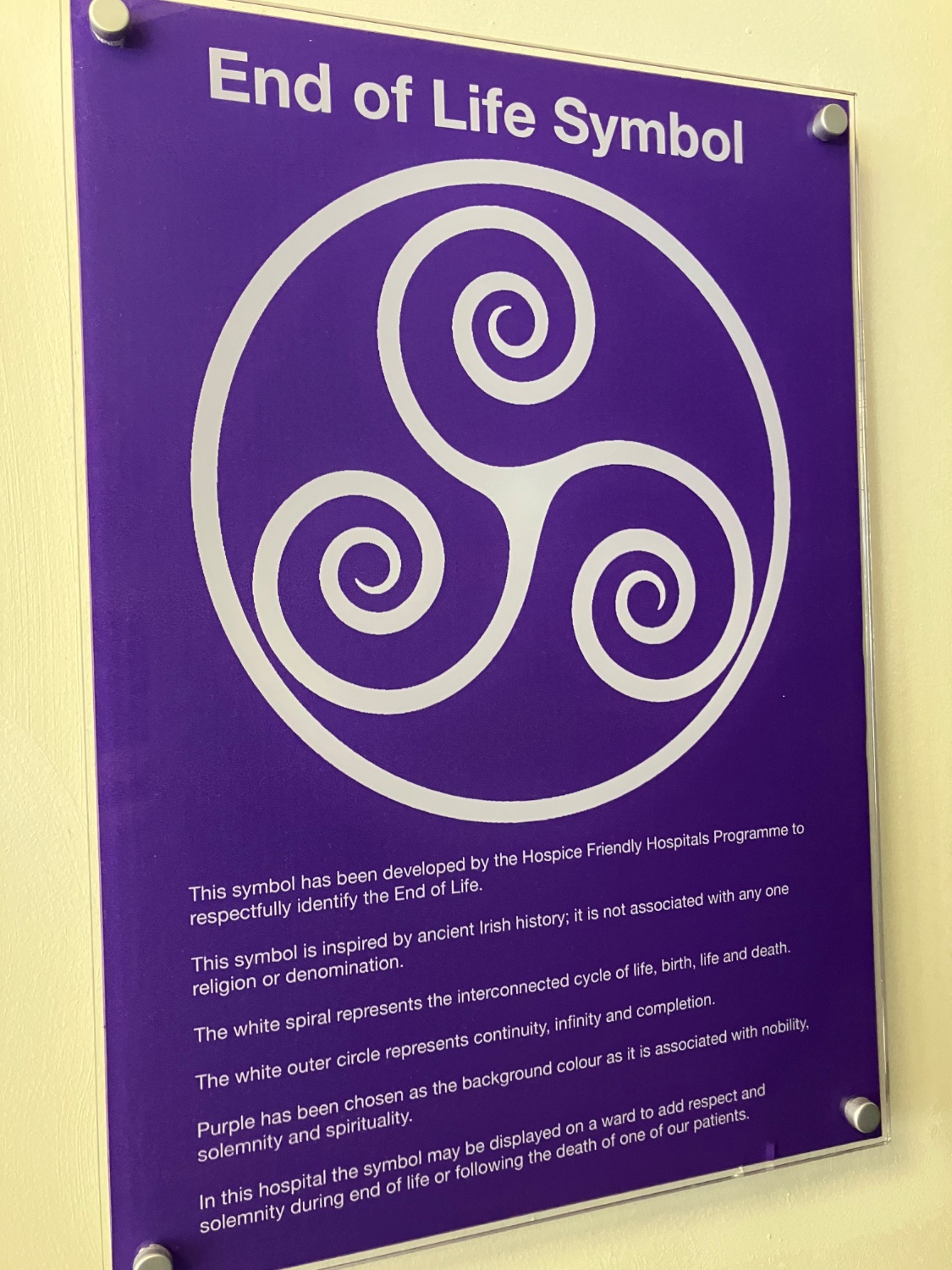 In this hospital the symbol may be displayed on a ward to add respect and solemnity during end of life or following the death of one of our patients.