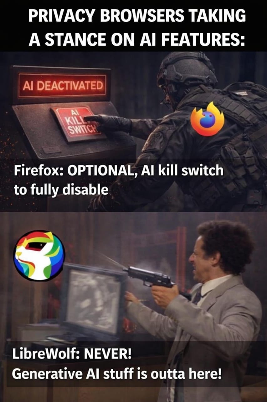 arrow-up142arrow-down1imageTwo Privacy Philosophies: Firefox vs LibreWolf on AIsh.itjust.worksxabd@sh.itjust.works to Memes@lemmy.mlEnglish · 14 小时前message-square5fedilink